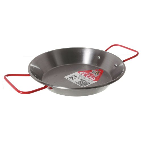 Garcima 8-Inch Carbon Steel Paella Pan, 20cm is best for youThis pan is the perfect size for serving tapas or a petite paella for one. Its 2 handles are made of steel and painted red. The pan is made of carbon steel (aka polished steel, or acero pulido), which is ideal for paella since it conducts heat quickly. The pan is thin but quite rigid and durable, with a dimpled bottom. Carbon steel is the traditional material for paella, and some paella devotees feel that it enhances flavor. As with any raw steel pan, it requires some care: you must dry the pan right after washing it and then rub the inside with a little vegetable oil to prevent rusting. If the pan does rust, a few passes with steel wool takes it right off.