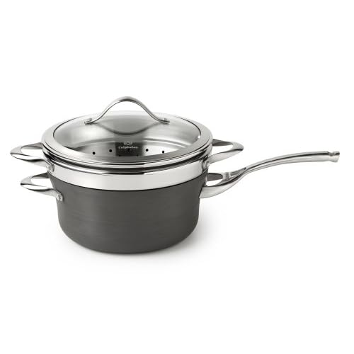Calphalon Contemporary Nonstick 4.5 Qt. Sauce Pan with Steamer Insert is best for youWhether you’re preparing a delicate Bearnaise or a meaty marinara, Calphalon’s nonstick sauce pans are designed for easy low-fat and no-fat cooking, easy cleanup and maximum performance. heavy-gauge aluminum construction guarantees even, efficient heating. The rolled, matte-finish Cool Touch handle stays cool on the stove top and provides a stable grip. Plus, the rounded bottom perimeter helps you scrape every spot inside the pan so no tasty spoonful goes to waste.